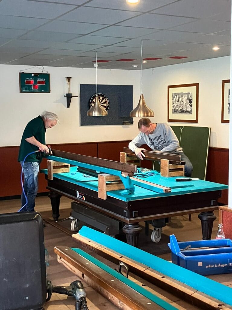 De oude biljartklok die nog op guldens ging, en het traditionele scorebord hangen nog altijd aan de muur ter herinnering aan vervlogen tijden. Tegenwoordig is de kassa voor verrekening uitgerust met een biljartknop zodat we kunnen sparen voor nieuwe lakens.